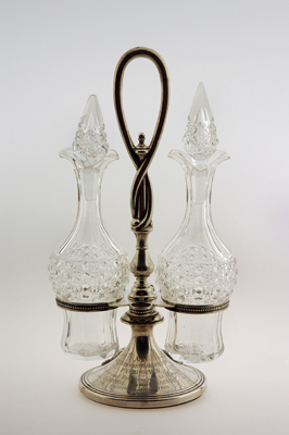 Schenker van olie- en azijnstel met Lam Gods en twee karaffen