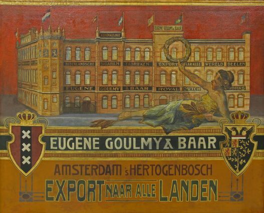 Bovenste helft van het schilderij wordt ingenomen door een fabriek in ´s-Hertogenbosch, met naamgever in de gevel. Thans is hier de Willem II-fabriek gehuisvest. Voor de gevel is een gracieus liggende vrouw afgebeeld met een lauwerkrans in haar rechthand. Onde de aanblik op het gebouw is een strook met het wapen van Amsterdam, nogmaals de naam EUGENE GOULMY & BAAR en het wapen van ´s-Hertogenbosch. Hieronder is een strook te zien met de plaatsnaam AMSTERDAM en ´s-HERTOGENBOSCH (vestingplaatsen) en de slogan: EXPORT NAAR ALLE LANDEN. Geheel is getoonzet in oker, rood, zwart en wit.