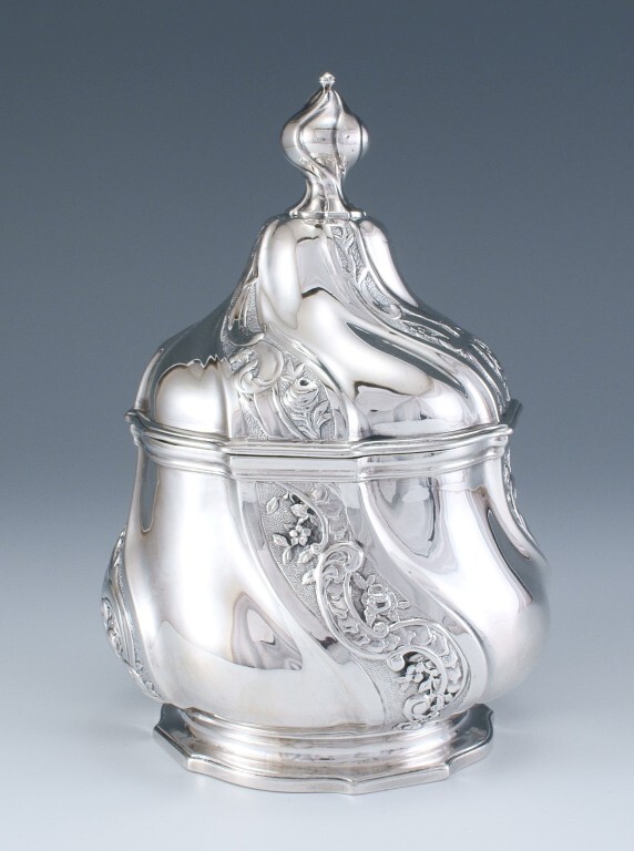 Getordeerde Louis XV tabakspot op gladde vierkante voet met accoloadevormige hoeken. De vier gladde a-symetrische panelen worden afgewisseld met vier panelen met versiering van bloemen en takjes en grote voluten op geruwde achtergrond, deze versiering loopt zich versmallend door in de losse deksel. De deksel wordt betkroond door een gladde getorneerde kop. De zilversmid Paulus van Beugen was regelmatig keurmeester voor zijn gilde en leidde negen leerlingen op.