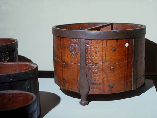 - BeschrijvingDroge maat, geijkt tot 1820. Op buitenzijde: gekroond wapen in schild boschboom met de letters A en D (?) de jaartallen 1807, 1808, 1809, 1810, 1811, 1812, 1816, 1817, 1818, 1819, 1820 Buitenzijde ijzeren bovenrand: 10