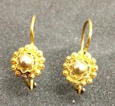 - BeschrijvingSet oorhangers. Centraal bloemmotief met een rand van sierknopjes. Versiering in ajour uitgevoerd.