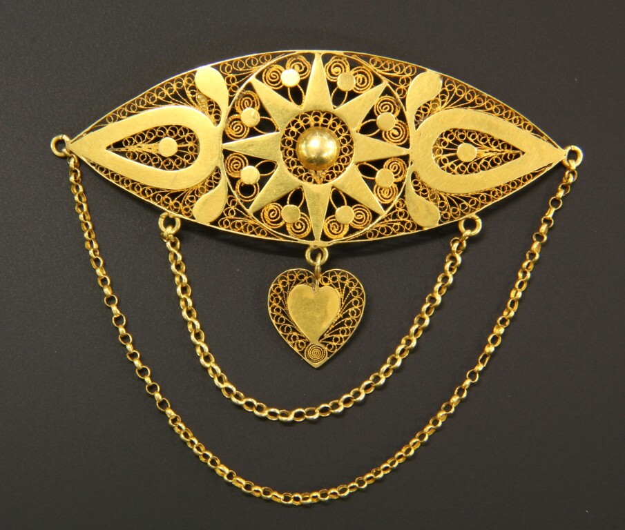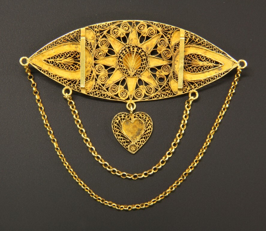 Een geelgouden zogenaamde borstzeug bestaande uit een bootvormige applique waarin een achtpuntige ster waartussen kleine ronde ornamentjes met aan weerszijden een opengelaten amandelvormig ornament op een ondergrond van cantillewerk. Afhangend onder de borstzeuge twee dunne kettinkjes, waarbinnen een hartvormig ornament op een achtergrond van cantille. Het woord ‘borstzeug’ ontleent zijn naam aan het feit dat dit sieraad door een man (in een boerengezin) aan zijn vrouw werd geschonken, als – nadat ze in het huwelijk waren getreden – de eerste biggen waren geboren.