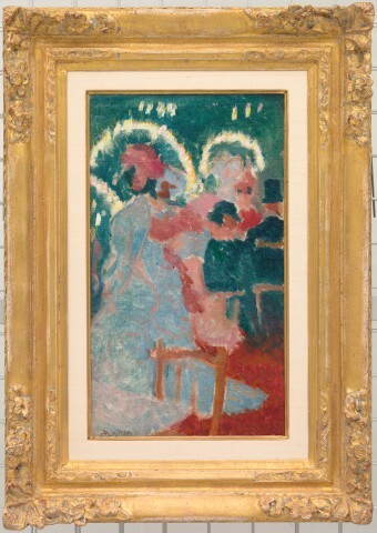 De studie toont links twee fraai getooide dames in lichte, sierlijke japonnen, die een sterk contrast vormen met de zittende mannen in donkere kostuums aan de rechterkant. Met korte toetsen plaatste Sluijters hen onder een hemel van moderne, elektrische verlichting. Café Olympia was een groot en extravagant theater, populair bij de Parijse elite.