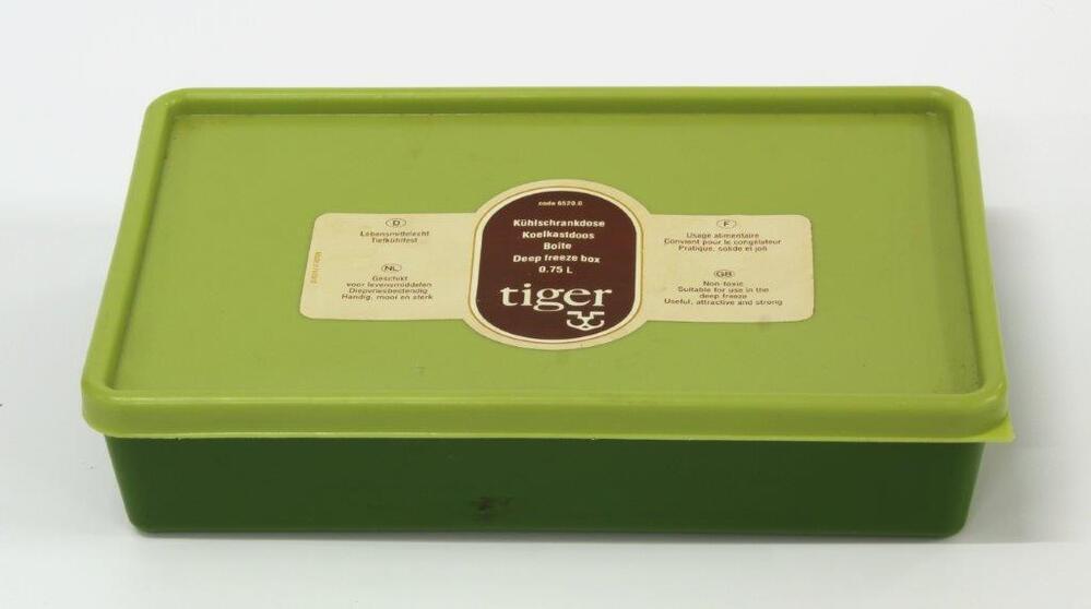 - BeschrijvingBestaand uit twee delen, een donkergroene box en een lichtgroene deksel. Inhoud 0,75 liter en met productsticker.