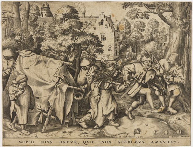 Een vuile en verwilderde vrouw neemt een man bij de arm, die verschrikt wil wegrennen. De woning van de vrouw bestaat uit wat stokken en lappen.Op de achtergrond een huis dat aan een kasteel doet denken. Drie figuren,in grote gewaden gehuld en met maskers op, fungeren als bruidsjonkers. Rechts van Mopsus een man, eveneens met masker, die een schop als muziekinstrument gebruikt.