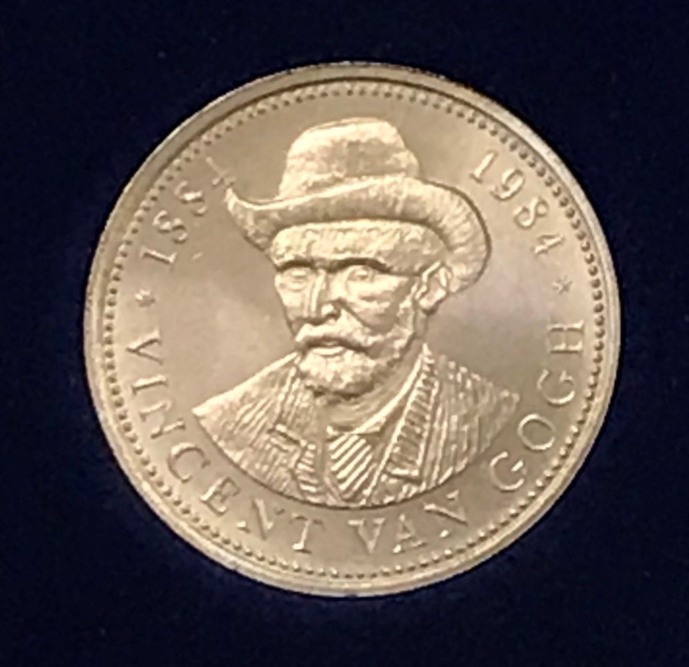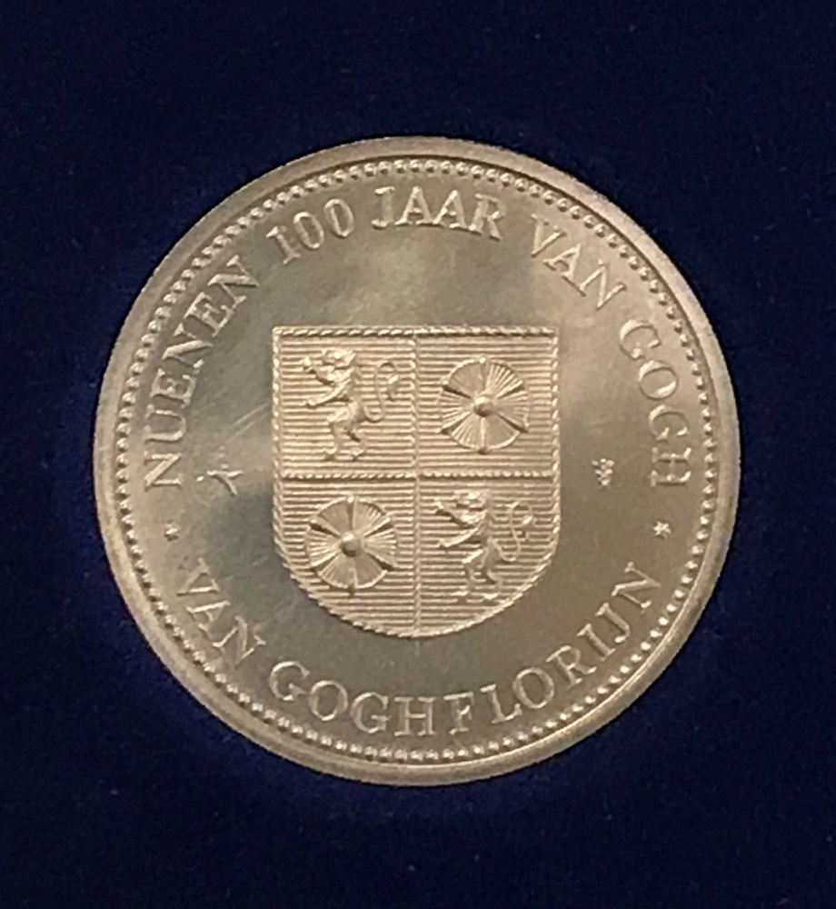 - BeschrijvingVoorzijde: portretbuste van Vincent van Gogh, "en trois quart" naar links, met een hoed op het hoofd. Om het geheel een parelrand. Keerzijde: het gemeentewapen van Nuenen. Om het geheel een parelrand. Uitgegeven door de gemeente Nuenen ter ere van het eeuwfeest van het Nuenense verblijf van Van Gogh.