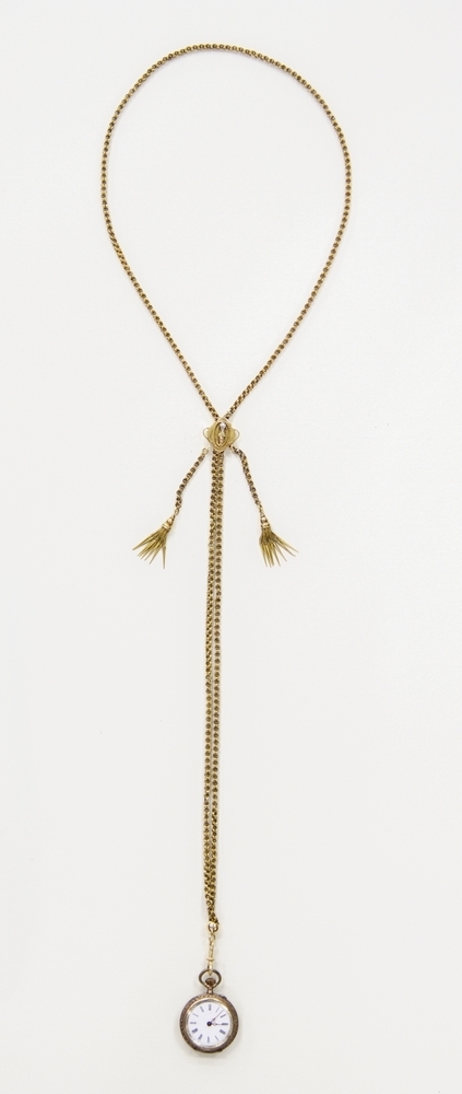 Deze horlogeketting voor dames was typisch Brabants. Sieraden vertelden vaak het verhaal over wie iemand was: of je getrouwd was bijvoorbeeld, of in de rouw, voor elke gelegenheid had men andere sieraden of kleding. Deze ketting was echt streekdracht en werd vaak in combinatie met een kruisje gedragen: zo liet men zien dat men uit Brabant kwam en katholiek was. Onderaan de ketting droeg men een horloge, dat men in het zakje van de rok deed. Zo’n lange horlogeketting werd vaak opgeknipt en vermaakt tot meerdere armbanden of kettingen om zo te kunnen verdelen over meerdere erfgenamen. Bij deze ketting is hiervan geen sprake, aangezien de ketting tot tweemaal toe via de enige dochter vererfde.