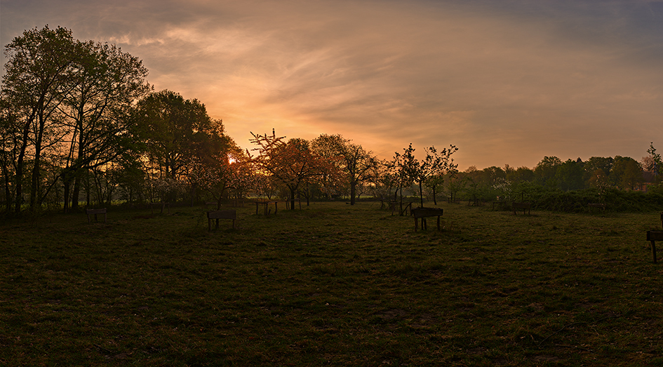 De laatste ochtend van mijn verblijf als ‘artist in residence’ in het fantastische onderkomen bij de boerderij van Leon Adriaans. Een van de lenteimpressies die ik maakte, is deze opname van de opkomende zon bij de intieme boomgaard van Haanwijk.