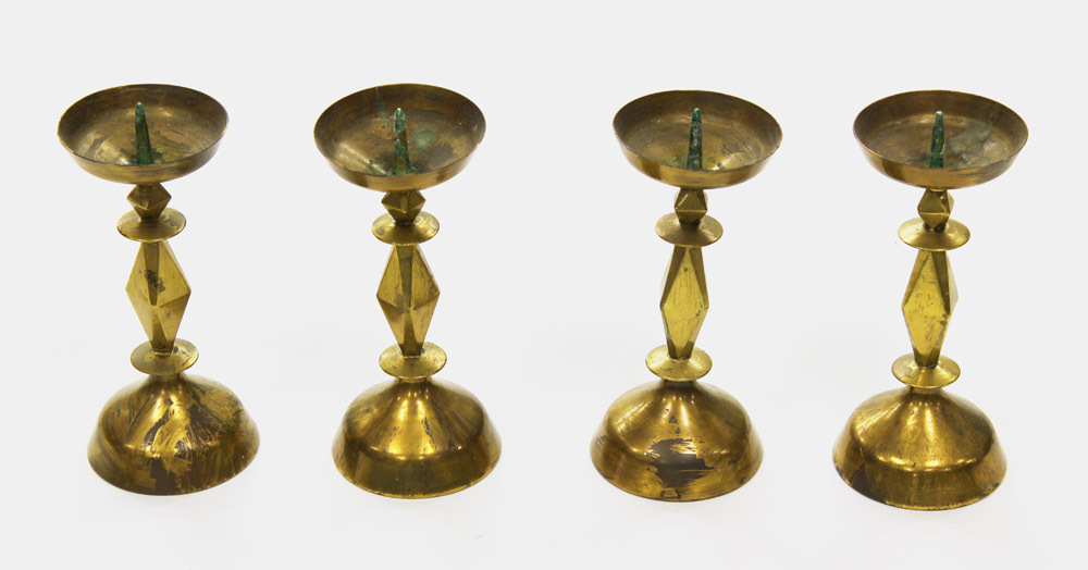 - BeschrijvingDe kandelaar rust op een ronde voet, heeft een ronde schijfnodus en een stam opgebouwd uit driehoeken. Daarboven zit een tweede schijfnodus en een kleine overgang naar de vetvanger, ook uit driehoeken opgebouwd. De vetvanger is schaalvormig en rond.