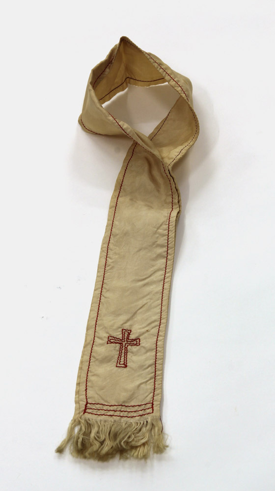 - BeschrijvingDubbelgevouwen en op een derde van de lengte aanelkaar genaaid. Met rood garen afgezette rand en op beide uiteinden een kruis. De uiteinden zijn voorzien van flosjes.