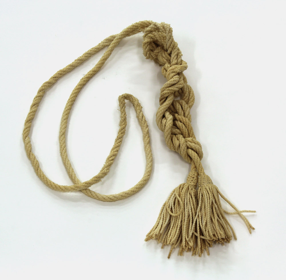 Uitgevoerd als een touw, inelkaar geknoopt. Flossen aan de uiteinden.