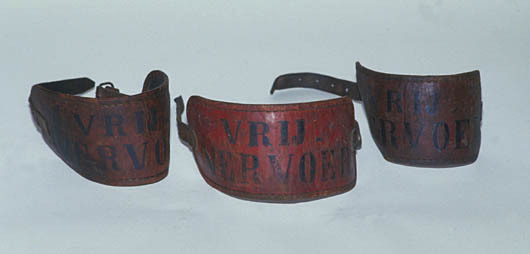Opschrift: "VRIJ-/VERVOER." Band met riempje om de arm te bevestigen