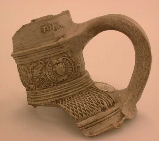 - Beschrijving- bolle schouder versierd met vertikale groeven en gestempeld netornament - hals onder en boven versierd met profielen waartussen een band van bladmotieven met 3 ronde appliques - gladde mondrand boven sterk geprofileerde ribbel - vertikaal bandoor aangezet op schouder en onder mondrand