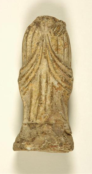 - BeschrijvingArmloze figuur in lang, verticaal geplooid gewaad, met rond het middel een horizontale lap stof, aan de ene zijde in punten oplopend naar de hals, aan de andere zijde met een grote lus bijeengebonden en opgehouden.
