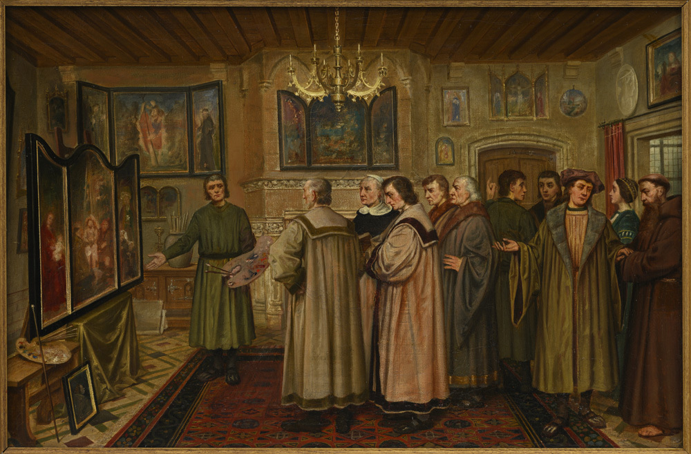 - BeschrijvingDe schilder Jheronimus Bosch staat links, met palet in zijn hand en toont zijn werk aan een groep mensen