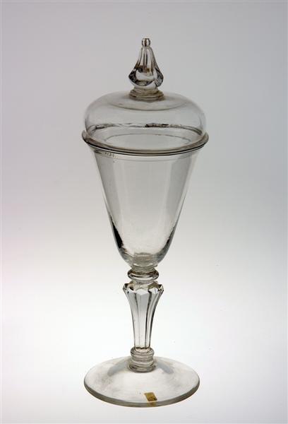 - BeschrijvingGedoomde voet. Silezische stam met ringvormige nodus. Licht kolkvormige cuppa. Gedrukt bolle deksel met vierzijdige knop