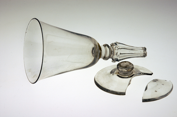 - BeschrijvingGedoomde voet. Silezische stam met ringvormige nodus. Licht klokvormige cuppa. Gedrukt bolle deksel met vierzijdige knop. Vgl. inv.nrs. 07138, 07139.