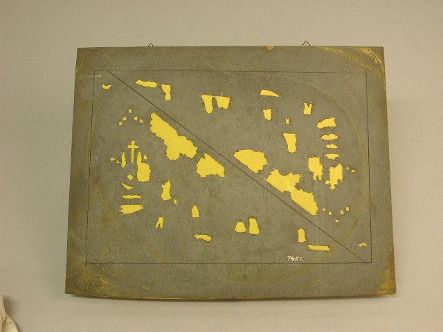 - BeschrijvingZinken plaat met uitsnijdingen voor het inkleuren van processievaantjes: geel Behorend bij drukblokken 7445-7448 Vastgeniet op houten plankjes. Zie inv.nr. 7445-7448 4 zinken platen: 07449 t/m 07452