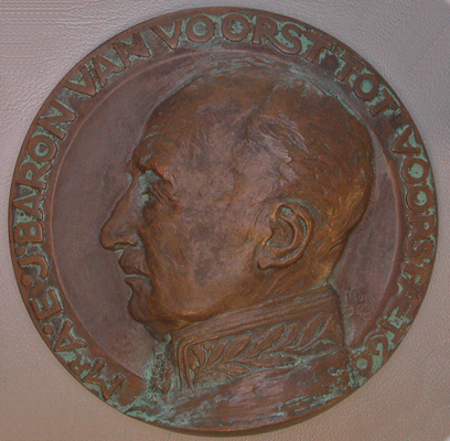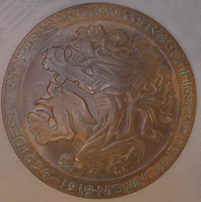 - BeschrijvingVoorzijde: portret en profile van A.E.J. Baron van Voorst tot Voorst. Randschrift: Mr. A.E.J+ BARON VAN VOORST TOT VOORST AET 60 Achterzijde: Brabantse leeuw en Hl in monogram Randschrift: DE.STATEN V NRD BRABANT &/D GRIFFIER A/O COMMISSARIS. DER. KONINGIN. 1894-1919 Vgl. inv.nr. 06332