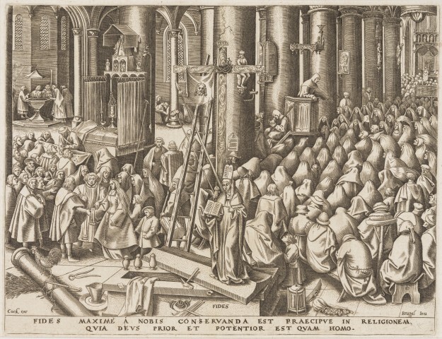 Onderschrift: "FIDES MAXIME A NOBIS CNSERVANDA EST PRAECIDVE IN RELIGIONEM, QVIA DEVS PRIOR ET POTENTIOR EST QVAM HOMO." Uit de serie van de 7 deugden. Eerste staat (van 2)