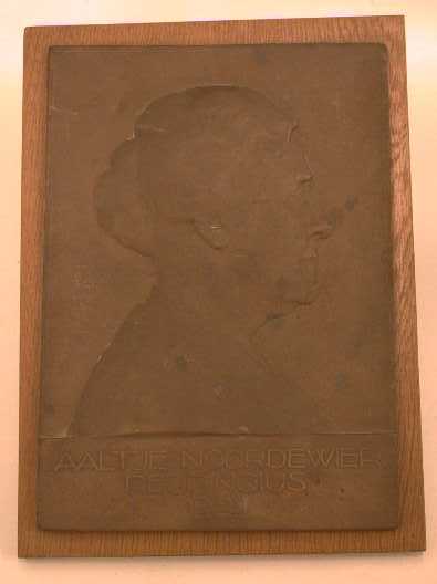 - BeschrijvingPlaquette, brons, bevestigd op houten plaat, met borstbeeld vrouw naar rechts. Er onder in kapitalen en gecentreerd: AALTJE NOORDEWIER-/REDDINGIUS/1921