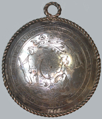 Voorzijde: gekroond wapen van 's-Hertogenbosch geflankeerd door twee wildemannen. Randschrift: "PIETER * MAAS * DEKEN * VANT * SCHIPPERS * GILDE * ANNO * 1768 *" Achterzijde: varende zeilboot met drie personen. Randschrift: "A * VARENDE * KORT * DEN * WEGH * DES * LEVENS *" Rand in de vorm van een kabel die ook het oog vormt.