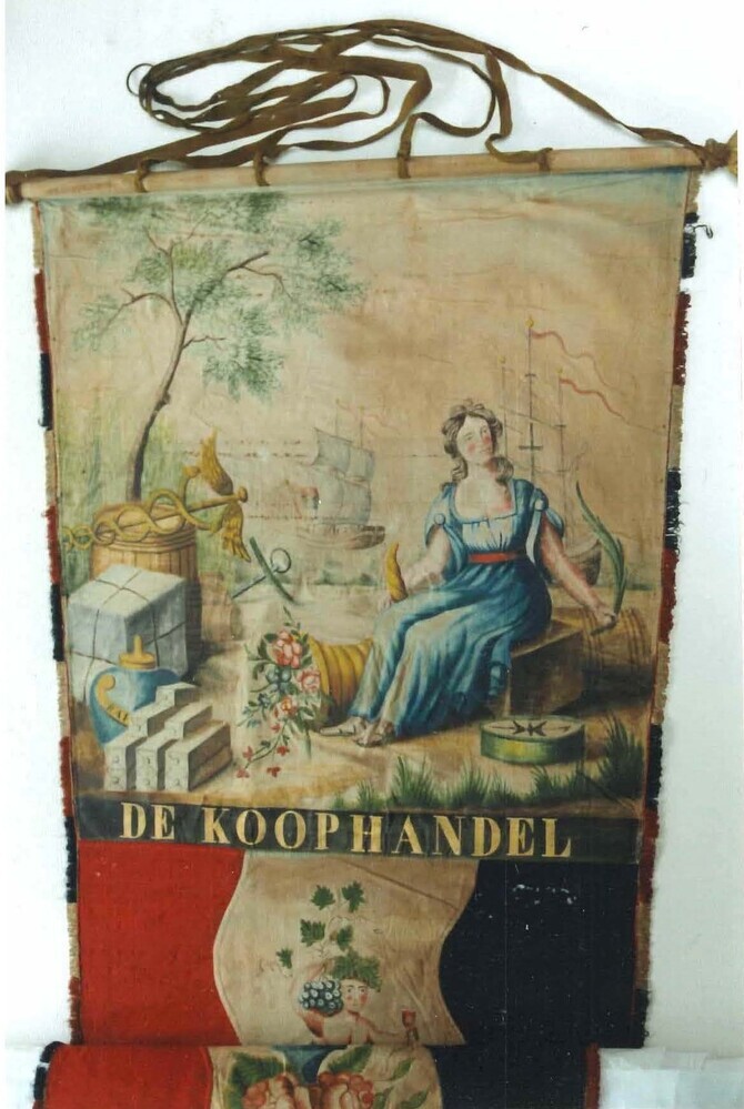 Voorstelling op witte katoen aan broekzijde: maagd in blauw gewaad, gezeten vóór boom op kist, met in de rechterhand een tak en in de linkerhand de hoorn des overvloeds met bloemen. Om haar heen op het land tonnen, pakken, een kompas, anker en staf van Mercurius. Achter de boom en op de voorgrond groene planten. Op zee 2 zeilschepen. Tussen de pakken een rond vat met op een gele band de letters "RAP" geschilderd (aan keerzijde de letters "PPE"). Onder deze voorstelling een zwarte band met de tekst "DE KOOPHANDEL". Onder de band bestaat de wimpel uit 3 banen: een rode en een blauwe van wollen vlaggedoek en een witte van katoen. De witte baan golft tussen de rode en blauwe door. Op de witte baan de volgende beschilderingen: - Bacchus gezeten op een ton tussen de wijnranken, een glas heffend - Vaas met bloemen - Decoratie met vergulde bloemen en rode en blauwe krullen - Engel met bazuin en gouden lint, staande op gouden bal in landschap - Vogel in gouden ring. Ring opgehangen aan blauwe strik. Aan ring hangt een bloemenmand aan blauw lint - Bloemenranken en krullen, waartussen geel vogeltje - Wijnranken om bazuin Achterzijde spiegelbeeldig identiek beschilderd (m.u.v. "DE KOOPHANDEL": zelfde tekst - niet spiegelbeeldig). Langs boven- en onderkant rood-wit-blauw wollen franje. Wimpel is aan vluchtzijde over een lengte van 62 cm gespleten. De witte linnen broek is om een houten stok genaaid. Aan beide uiteinden van de stok een ronde vergulde houten knop met uitgesneden bladeren-rozetten. Aan de stok 6 groene wollen bandjes door een koperen ring geregen.