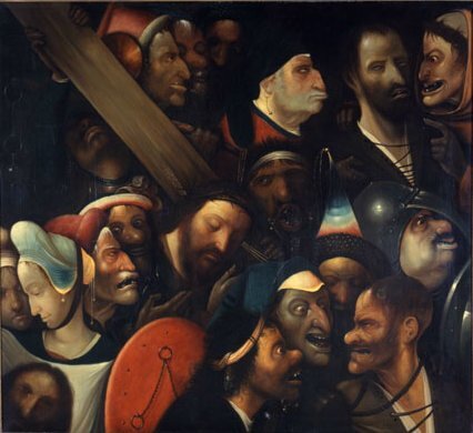 Omringd door zeventien soldaten en beulen met karikaturale koppen, draagt Christus het kruis. Hij heeft zijn ogen gesloten. Linksvoor staat Veronica met het doek waarop het gelaat van Christus is afgebeeld. De kruisdragende Christus temidden van de fysionomieën van de haat, hoogmoed, onverschilligheid, wreedheid en mededogen.