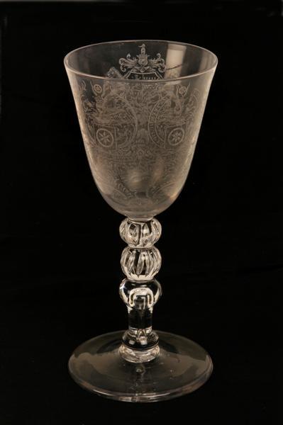 Konische voet. Stam met ringvormig voetje, omgekeerde baluster met ingestoken luchtbel en twee nodi met ingestoken luchtbellen. Trechtervormige cuppa. Gravure: voorzijde: Wapen Van der Does, dragers twee afgewende leeuwen. Onderschrift: Den Hoog edele geboren Heer Joncheer / Wigbold Jan Theodoor baron van der Does Heere van Beyde de Noordwijken beschreeven / in de orde van de ridderschap en edelen van / Holland en West Vriesland Casteleyn drossaert / en dijkgraave van stad en lande van Heusden / mitsgaders van de heerlijkheden Engelen en / Vleymen hoogheemraad van Rhijnland commissaris / van de posterye van Haar Edele Grootmoogende / de Heeren Staaten van Holland en West Vriesland / Anno 1762. Achterzijde links: wapen van Heusden met onderschrift "Stad van Heusden". Rechts: wapen land van Heusden met onderschrift "'t Land van Heusden" en rondschrift "Ru. Heusdenstum / S. praefect. agge.". Rond de wapens een decor van rocaille ornament e.d. Beker puntgaaf.