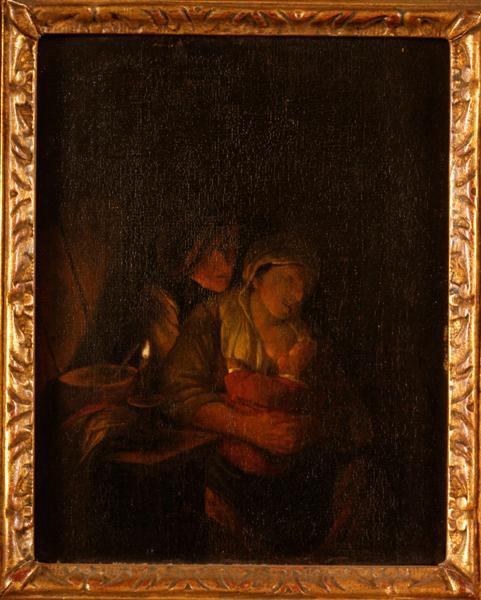 - BeschrijvingIn een vertrek voedt een vrouw een kind aan de borst terwijl een man achter haar toekijkt.