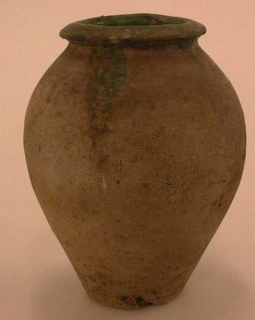- Beschrijving- vlakke bodem - peervormige buik met draaigroeven - insnoering onder mondrand - horizontale, naar buiten schuin aflopende mondrand - wit aardewerk met rossig/rode vlekken, van binnen groen geglazuurd