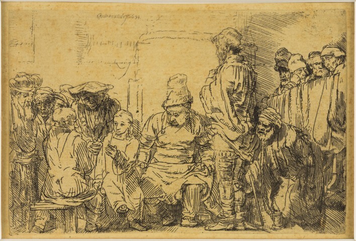 - BeschrijvingChristus zittend op een bank, temidden van de schriftgeleerden.