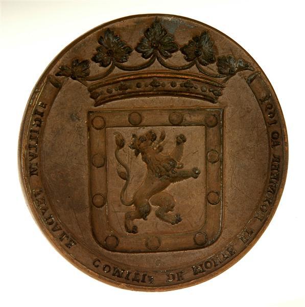Leenzegelstempel van de graven van den Berg, Heren van Boxmeer: Op een schild de afbeelding van een klimmende leeuw, dubbelstaartig, getongd en gekroond. Op de zoom (een strook langs de schildrand) 11 cirkels. Het schild wordt gedekt door een kroon. Randschrift:SIGILLUM FEUDALE COMITIS DE MONTE ET BOXMEER Ao 1691. Op de achterzijde een korte koperen huls voor het bevestigen van een handvat
