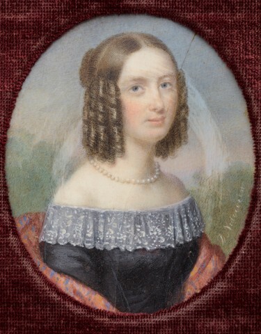 Busteportret van een vrouw, naar rechts gewend. De vrouw draagt een zwarte japon met laag decolleté, dat de schouders geheel vrij laat. Het decolleté is aan de rand afgezet met een strook witte kant.Om de hals bevindt zich een eenvoudige parelsnoer. De vrouw heeft een strak kapsel met scheiding in het midden, dat aan de zijkanten over gaat in pijpekrullen en aan de achterzijde in een knot. De armen worden voor het grootste gedeelte bedekt door een roodkleurige omslagdoek. De achtergrond is in een neutrale blauwgrijze en groene kleur gehouden.