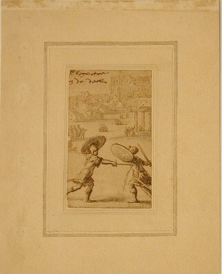 - BeschrijvingTweekamp tussen soldaten met zwaard en schild. Op de achtergrond zicht op de stad Rome met Colloseum.
