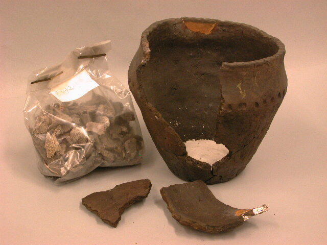 Nr. 1 opgraving Best. Gerestaureerde zo goed als gave paarsrode, afgeknot peervormige urn met ruw besmeten buikoppervlak. Hals laag, cylindrisch, een weinig ingesnoerd en gladgestreken. Rand niet verdikt, van boven door vingertopindrukken gekarteld. Overgang van buik tot hals versierd met een krans van vingertopindruksels. Inhoud lijkbrandresten