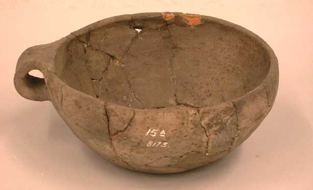 - BeschrijvingEenorige lichtbruine schaal met een verdikte, licht naar binnen neigende platte rand. De bodem is vlak en het oor steekt niet boven de rand uit.