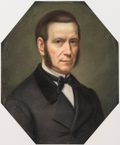 - BeschrijvingTegen een groen fond is afgebeeld het borststuk van een man, naar links gewend. Hij is gekleed in een zwart kostuum, met een wit hemd en zwarte das. Hij heeft bruin haar, lange bakkebaarden en blauwe ogen.