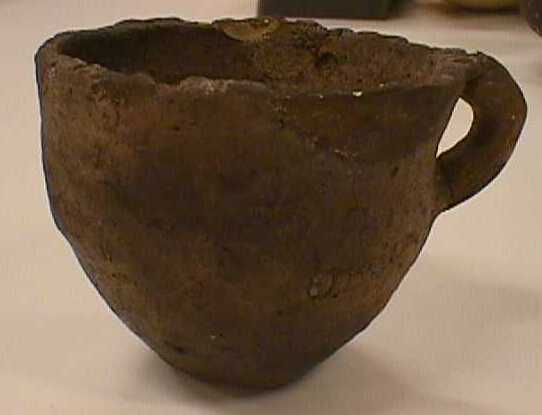 - BeschrijvingNr. 40. Eenorig bekertje van lichtbruin aardewerk rand door vingertop-indruksels versierd bodem enigszins convex oor staand, halfcirkelvormig, komt niet boven de rand uit.