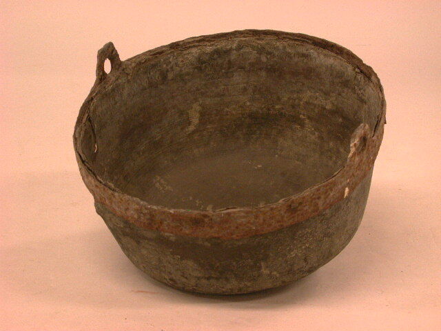 - BeschrijvingKoperen pot, zwart patina met bollende bodem en ijzeren ringband met twee opstaande nokken voor (ontbrekend) ijzeren? hengsel.