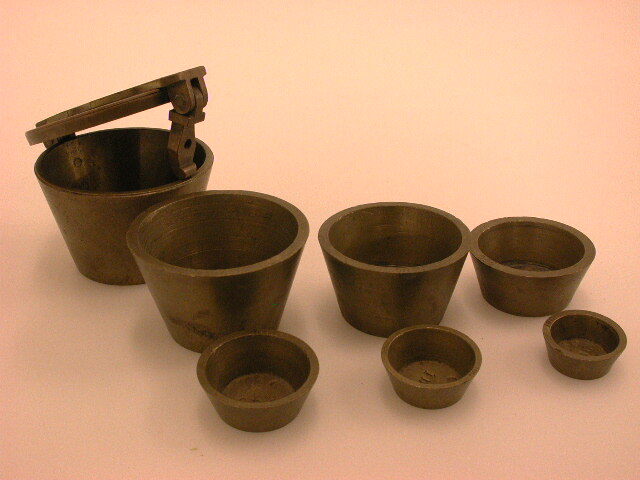 Sluitgewicht met 5 (resterende) opvolgende binnengewichten en een niet origineel 6e kleinste gewicht. Het totale gewicht is (was) ca. 500 gram. Aan de deksel een scharnier en pinsluiting. Op de deksel: , 85, A, I en een lopende ooievaar naar links tussen een Z en een soort liggende E (= fam. Abend, zie expertises). In de bodem van het hoofdvat: 16 In de bodem van het 1e binnenvat: 8 en 85 In de bodem van het 2e binnenvat: 4 en 85 In de bodem van het 3e binnenvat: 2 en 85 In de bodem van het 4e binnenvat: 1 en 85 In de bodem van het 5e binnenvat: 85 In het 6e binnenvat: N.I. (2?) W (= 2 wichtjes), K(=1854), E(= J. Everts, 's-Hertogenbosch, handelaar in maten en gewichten en ijkmeester), E (idem). Op de rand: 2 W (= 2 wichtjes).