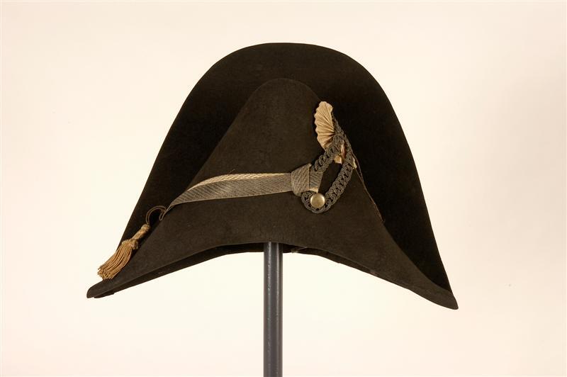 Steek van zwart harig vilt. Opgeslagen rand aan de achterzijde vlak, aan de voorzijde om de bol van de hoed gebogen. Op de voorkant een oranje zijden kokarde waarover een lis van gevlochten zilverkoord. Gladde, koperkleurige metalen knoop. Om de lis is goud(zilver-?)koord geknoopt, waaraan 2 kwastjes met peer van zilverdraad en franje van crèmekleurige zijde en gouddraad. Dit koord behoort om de bol geknoopt te zijn, met afhangende kwastjes. Om de lis geknoopt en aan de voorkant vastgezet: een dragon. Dragon model ca 1825, voor onderofficier. Achter de kokarde en de omgeslagen rand aan de voorkant resten van zwarte ribzijde. Om de bol een zwart koordje. Zweetband van bruin geprent leer. Voering van de bol: zwarte zijde. Tussen hoed en zweetband een reep wit papier. Met behulp van koperdraad en garen is de achterrand aan de bol bevestigd. Op de achterrand enkele steken zwart garen. Steek gezien door dhr. F.J.H.Th. Smits d.d. 7-9-1983. Zijns inziens hoort de dragon niet bij deze steek.