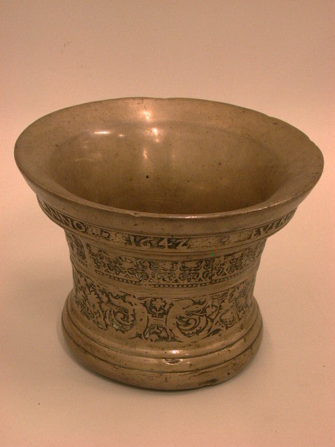 - BeschrijvingVoet met twee profiellijnen. Brede uitkragende rand met opschrift in kapitalen: EVERHARDUS SPLINTER ME FECIT ENCHUSA 1642 Rondom een breed fries met renaissancistische decoratie, waartussen enige monsterkoppen in kwabstijl. Daarboven een smaller fries met gotische kruisbloemen boven een parelrand.