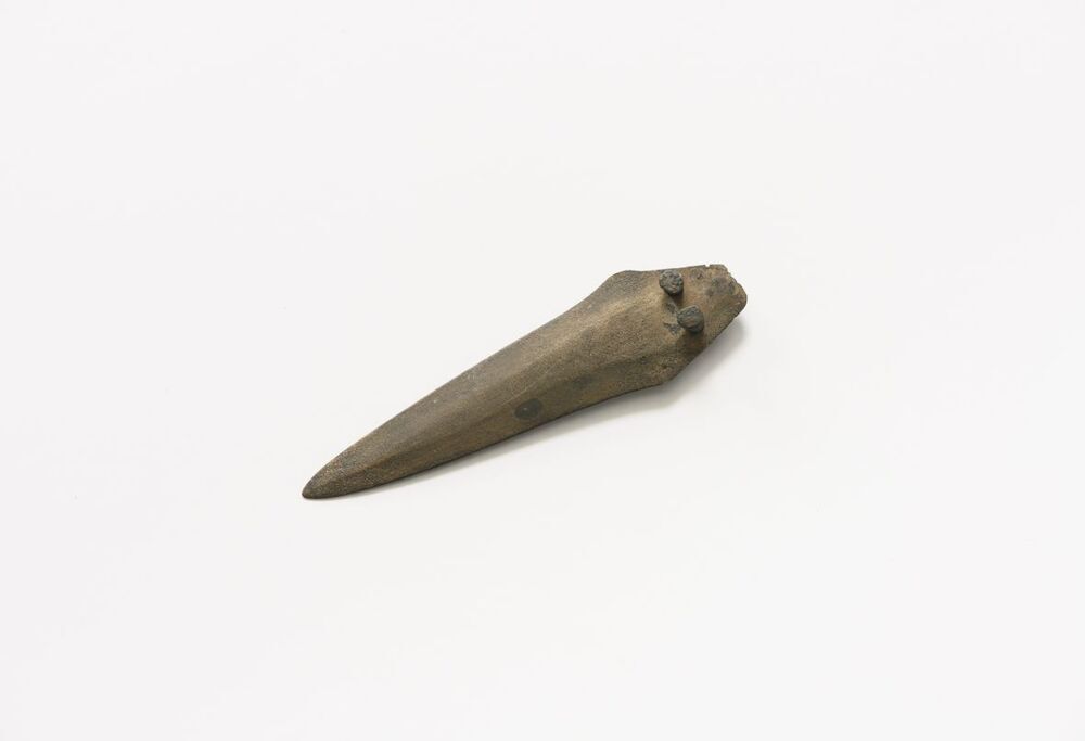 - BeschrijvingBronzen dolk uit de ouderen - midden bronstijd. De beide bevestigingsboutjes zijn met een omlopende spiraalgroef versierd. Opgebaggerd uit de Maas tussen Bokhoven en Hedel.