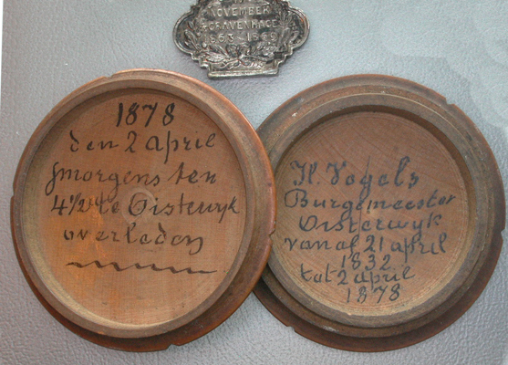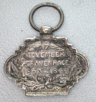 Door Prins Frederik der Nederlanden in 1869 uitgereikt aan H. Vogels, van 21 april 1832 tot 2 april 1878 burgemeester van Oisterwijk, als lid van het comité tot inzameling van gelden voor het monument ter herdenking van Nederlands onafhankelijkheid in 1813. Voorzijde: binnen lauwerkrans: "NATIONAAL/GEDENKTEEKEN/1813". Achterzijde binnen lauwerkrans: "17/NOVEMBER/ 's GRAVENHAGE/ 1863-1869". In rond houten doosje