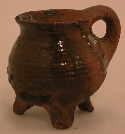- Beschrijving- lensvormige bodem - 3 standpootjes - peervormige buik met draairibbels - trechtervormige hals - ronde mondrand - vertikaal worstvormig oor aangezet op buik en mondrand, zodanig dat het boven de mondrand uitsteekt - gedeeltelijk bedekt met bruin loodglazuur
