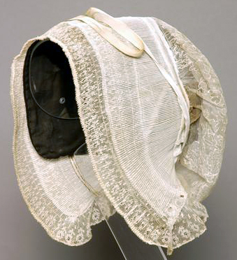 Muts met fijn geplooide voorstrook, 10.5-12.5 cm. breed, bestaande uit 2 delen: een strook kant 8 cm. breed en een strook gaas 7.5-9 cm. breed. De kant en het gaas overlappen elkaar over een breedte van 4.5 cm. De kant van de voorstrook loopt op halve breedte door langs de zijkanten van deze strook en is daar gerimpeld aangezet. Voorstrook aan beide zijden verstevigd met sutiën. Tulen schildje, 1.5 cm breed. Bodem van doorgestopte tule met eenbloemig patroon. Aan de onderzijde van de bodem in lussen genaaid katoenen garen, waardoor twee katoenen bandjes geschoven zijn. Kroezel of kroon. Op een brede strook gesteven gaas zijn takjes bloemen genaaid. Takjes met geel/cremekleurig papier omwonden ijzerdraad. Bloemetjes van witte gesteven katoen. Meeldraadje wit, knopjes geel. Tussen de bloemetjes glazen bolletjes op steeltjes (dauwdruppeltjes) en witte katoenen tule. Langs beide zijden van de strook katoen zijn smalle kantjes genaaid. Aan de korte zijden zijn cremekleurige zijden linten met ingeweven bloemmotief gezet. Linten afgezet met een kantje. In het midden van de linten een plooi. Sluiting met haakje en oogje. Kroon in 1986 aangetroffen met inv.nr. 8741. Mogelijk is dit niet het juiste nummer! In 1937-1938 opnieuw ingeschreven onder nr. 8741. Het oorspronkelijke inv.nr. was 7723. In de aantekeningen op het briefje achter inv.nr. 8678 in het inv.boek worden 2 strikken uit Princenhage, 1 kroon uit de Baronie van Breda en 1 kroon uit Made (samen met een muts) vermeld. In 1937-19938 wordt onder de inv.nrs. 8740 en 8741 telkens een muts met kroon beschreven en onder de inv.nrs. 8742 en 8748 een muts met strik. Mogelijk zijn in 1937-1938 deze mutsen, kronen en strikken met elkaar verwisseld. Zie ook inv.nr. NN 246