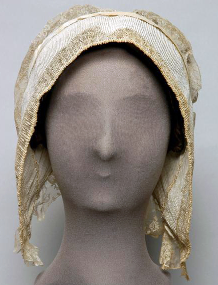 Muts met fijn geplooide voorstrook, 10-13.5 cm. breed, bestaande uit 2 delen: een strook kant van 8 cm. breed en een strook gaas van 7-9.5 cm. breed. De kant en het gaas overlappen elkaar over een breedte van 5 cm. Aan beide zijden van de geplooide strook is een reepje kant (op halve breedte) gerimpeld vastgezet. De voorstrook is aan beide zijden verstevigd met sutiën. Tulen schildje 1 cm breed. Bodem van doorgestopte tule. Het patroon bestaat uit losse rozetten van bloemen met daartussen een strooimotiefje. Aan de onderzijde van de bodem in lussen genaaid katoen garen, waardoor twee katoenen bandjes geschoven zijn. Cremekleurige zijden strik, satijn met bloemmotief. Vanuit de knoop in het midden naar beide zijden twee lussen en een lint. De linten zijn aan de uiteinden geplooid en worden onder de muts met elkaar verbonden door middel van een haak en een oog.