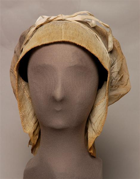 Muts, geheel van witte katoenen tule vervaardigd. Fijne geplooide voorstrook, 9.2 cm. breed. Beide uiteinden van de strook zijn over een lengte van ca. 35 cm. niet geplooid, maar gerimpeld aan de achterkant van de voorstrook vastgezet. (er ontstaat aan beide zijden een 'waaier' onder de voorstrook). Schildje ca. 1.5 cm. breed, van tule op grof gaas. Bodem van onbewerkte tule met aan de onderzijde lussen van katoenen garen waardoor 2 linnen bandjes geschoven zijn. De voorstrook is aan beide zijden verstevigd mt wit sutiën. In 1937-1938 opnieuw ingeschreven onder inv.nr. 8743. Het oorspronkelijke nummer is 7723.