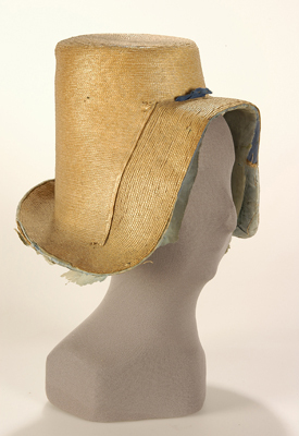 Hoed met kleine opstaande rand van gevlochten stro. Gevoerd met lichtblauwe zijde. Boven de achterrand is aan de binnenzijde een blauwe katoenen lus genaaid. Tussenvoering langs de onderrand aan de achterzijde van blauwe wollen stof. Blauw vilt tussen voering en stro. Werd over de lange witte kanten vleugelmuts gedragen ter bescherming daarvan. Op de oude inv.kaart wordt daarbij nog vermeld: vleugelmuts "welke voor 1880 gedragen werd, vooral door marktvrouwen, afkomstig uit Princenhage". In 1937-1938 opnieuw ingeschreven onder nr. 8750. Het oorspronkelijke nr. was 7723.